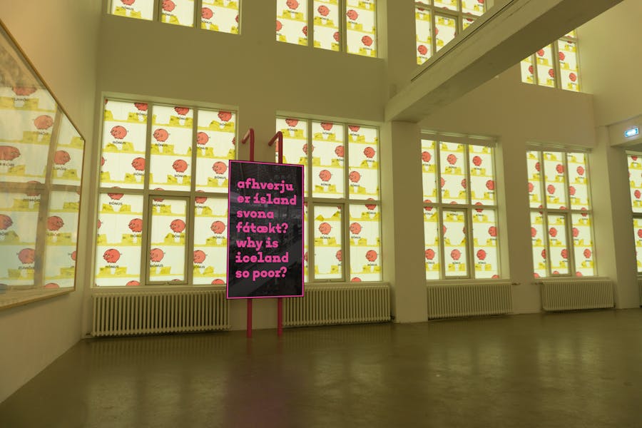 “Why is Iceland so poor?” asks artist Sæmundur Þór Helgason in a new work exhibited at The Living Art Museum in dialogue with selected works from the museum's collection. The aesthetics of the exhibition are inspired by the graphic identity of Bónus, a chain of grocery stores that was originally founded to provide their customers with the lowest possible food prices.