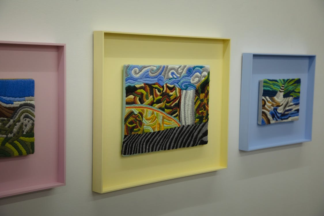 Guðrún does not sketch but creates her visual works on the embroidery surface, the size of the canvas determines their outer limits. On the picture surface, it is then a thread and a needle that follow each other until the picture is complete. It is unusual to see embroidery works that are as alive as Guðrún's work.