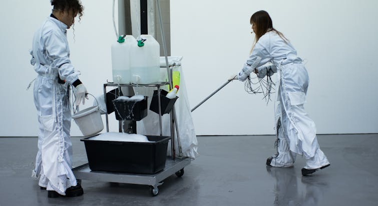 For last year's Sequences X Art Festival they showed the performance/social choreography PUTI at OPEN . For PUTI (meaning white) the artists wore white clothes and took on the roles of cleaners, a job which many Filipinos in Iceland have and is often associated with immigrants.